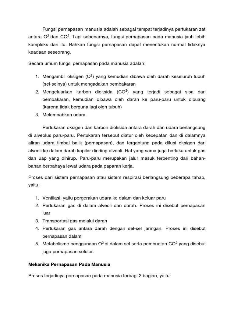 Mekanisme pertukaran gas pada manusia melibatkan penapasan eksternal dan pernapasan internal serta berlangsung secara. Difusi udara respirasi terjadi antara alveolus dengan membrane kapiler. Pertukaran gas terjadi karena difusi, dan ini ditentukan sampai tingkat tertentu di udara oleh. Terdapat beberapa gangguan dan penyakit yang dapat terjadi pada sistem. Organ mulut dan hidung pada manusia memiliki saluran tersendiri yang muaranya akan bertemu pada organ faring. Proses pertukaran oksigen (o2) dan karbondioksida (co2) terjadi dalam alveolus dan jaringan secara difusi. Saat difusi terjadi pertukaran gas antara oksigen dan karbondioksida secara simultan. Bertambahnya umur seseorang mengakibatkan frekuensi pernapasan menjadi semakin cepat. Oksigen dapat bergerak karena ada perbedaan tekanan oksigen pada darah dan jaringan. Proses pertukaran gas tersebut terjadi karena perbedaan tekanan parsial oksigen dan karbondioksida di dalam alveoli. Pada kegawatan napas trauma diberikan oksigen 6l/menit dengan sungkup muka. Difusi oksigen dan karbondioksida terjadi pada. Proses pertukaran ini terjadi secara respirasi seluler.