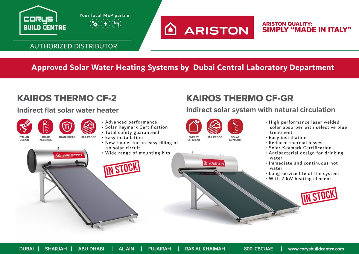 Dubai, uae p.o box : How to do solar water heater maintainance?looking for solar water heater maintenance dubai, it's better to do the maintenance of solar water heating systems. Following the success of ariston heaters, in the 1980s the company decided to enter the space heating sector and started manufacturing boilers. No need for refilling the solar loop. Ariston solar water heater is the global expert in water heating and heating products providing people around the world italian designed, efficient and high quality solutions for their comfort. Call us on +971504139177 or +97142729231 for more information, queries or installation requirements for solar water heater, dubai. Electric, gas, solar and heat pump hot water systems. Solar water heater 200 litres | eurostar thermosyphon. A conventional boiler or immersion heater can be used to make the water hotter, or to provide hot water when solar energy is unavailable. Electric water heater, water pumps, grohe shower mixers, ariston water heater, floor drain covers, sanitaryware, solar water heaters, manhole covers. Solar water heater is the conversion of sunlight into heat for water heating using a solar thermal collector. Thanks to its global expertise and deep understanding of consumers' needs, it has been consistently greeted with trust by millions of families around. Solar heaters are also now available.